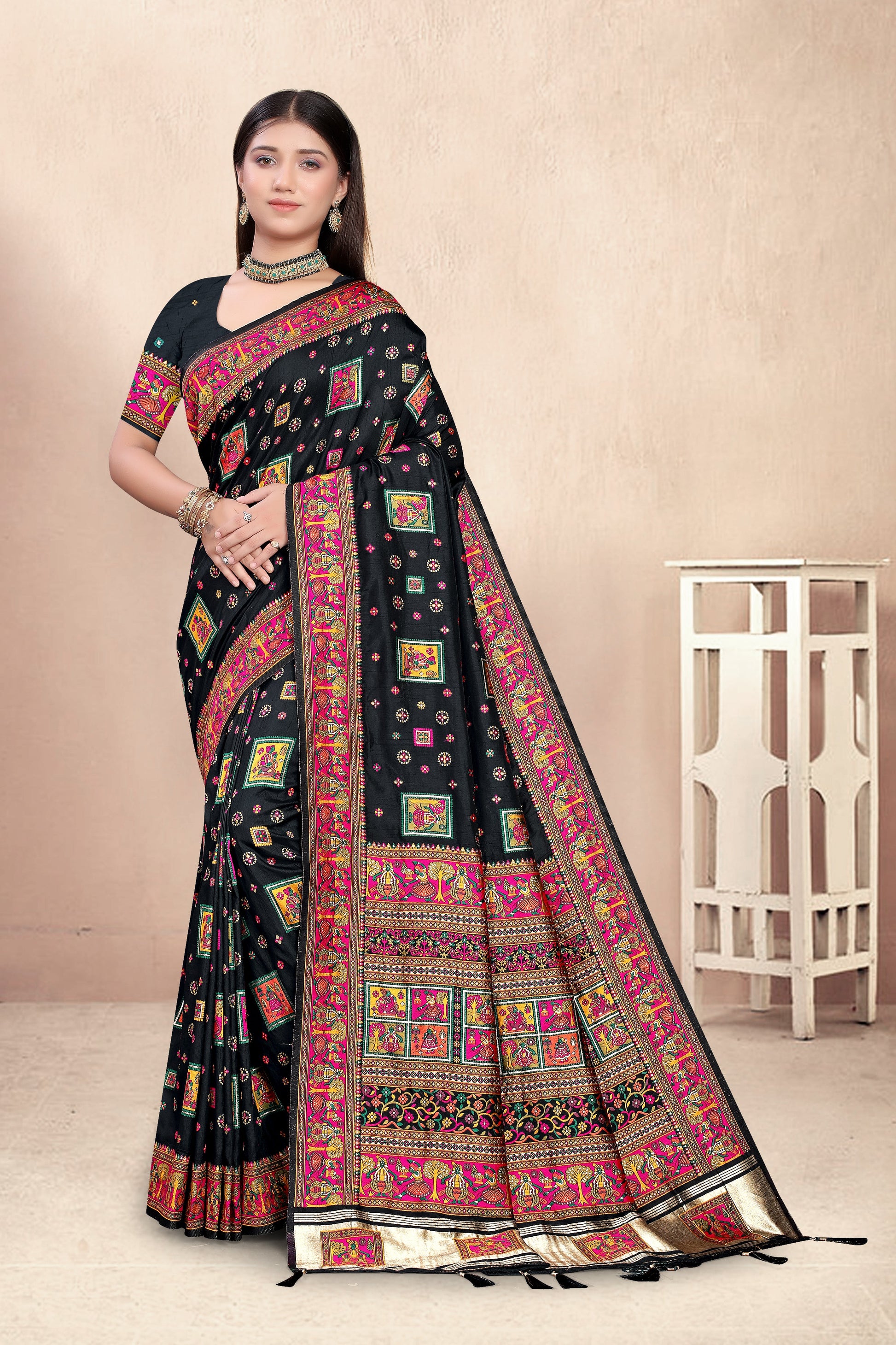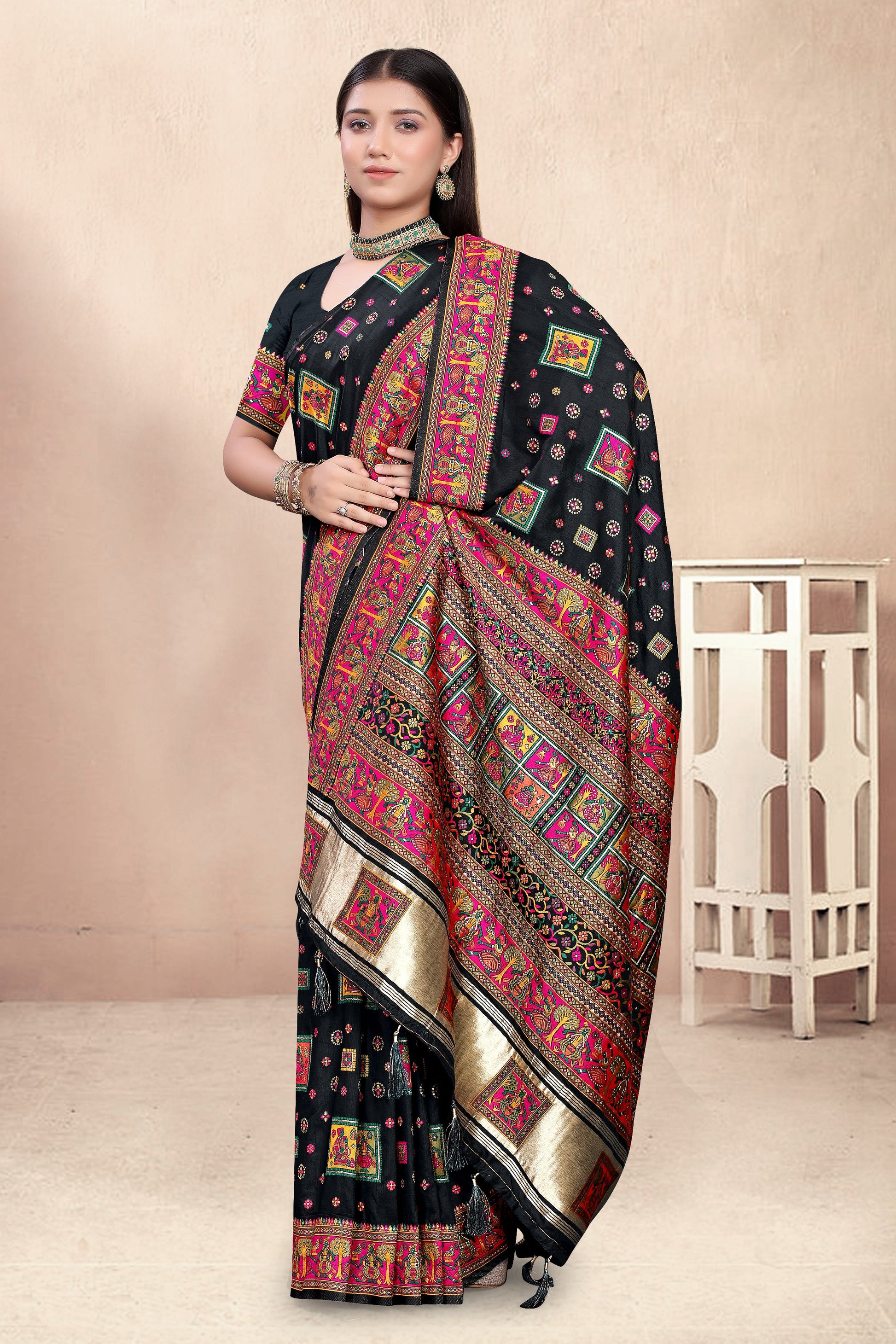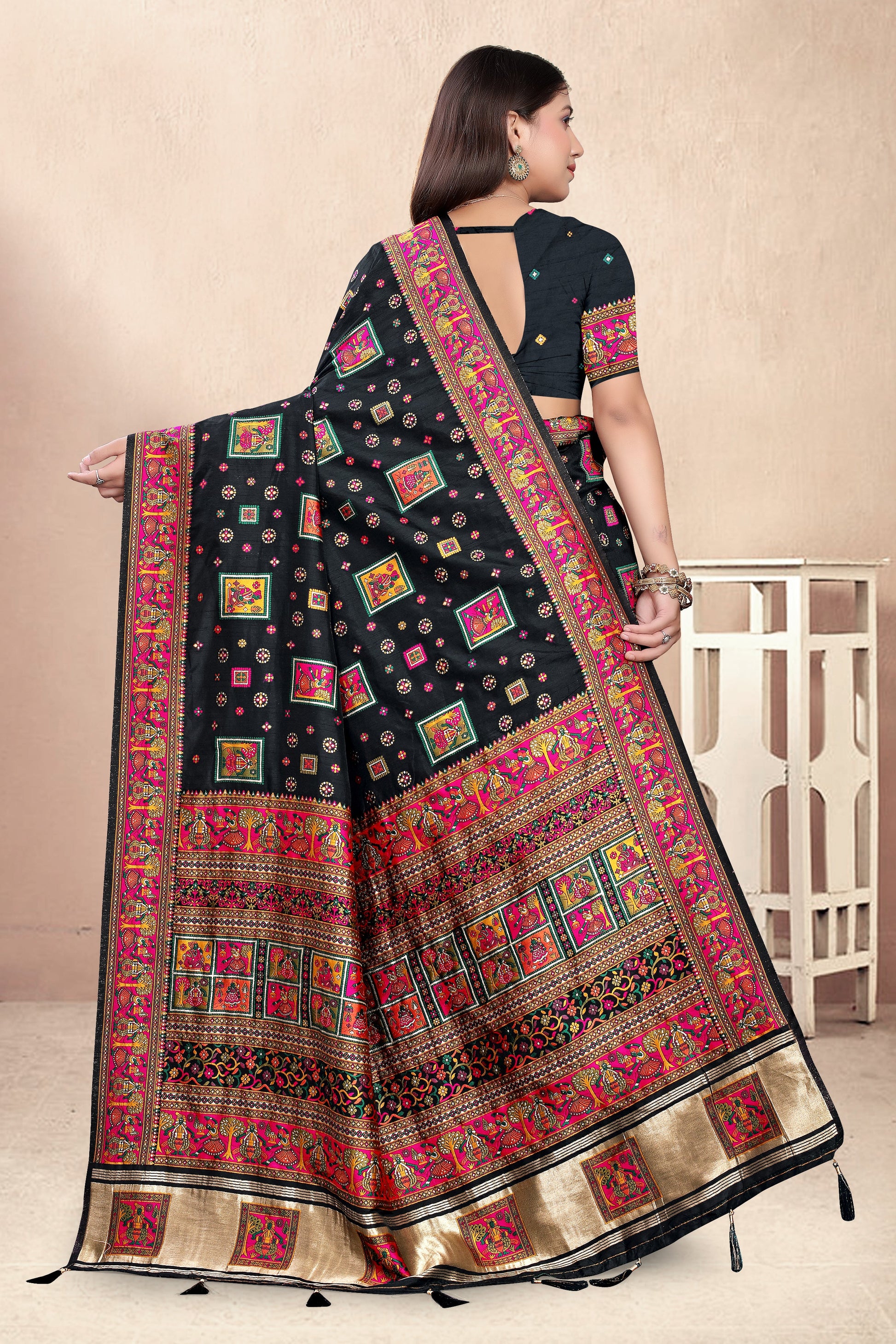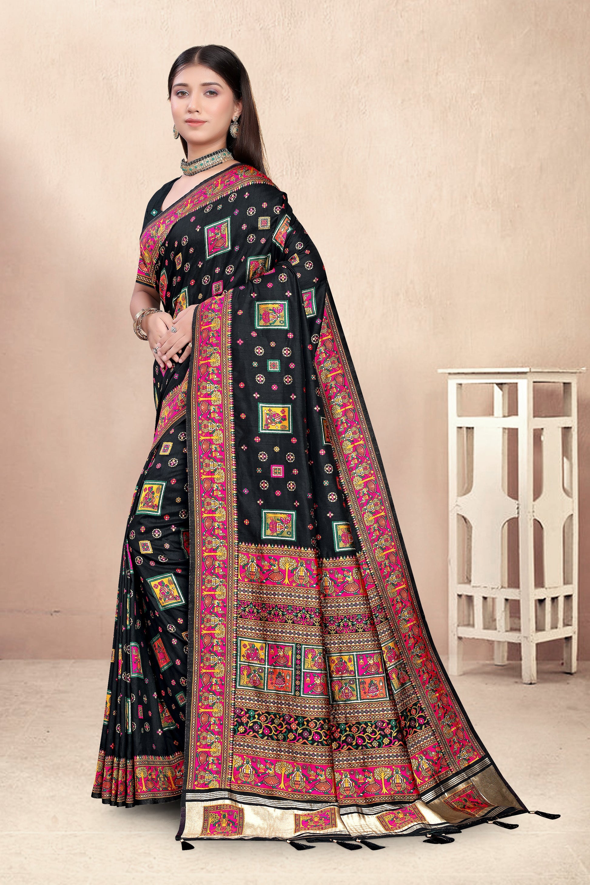 Patola Charm – Black Silk Saree with Colourful Folk Artwork Border