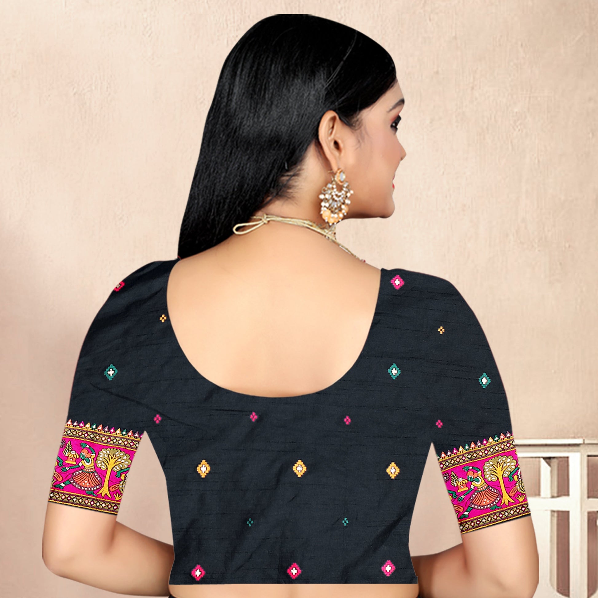 - Type: Black Cotton Silk Saree with Vibrant Tribal Motif Embroidery