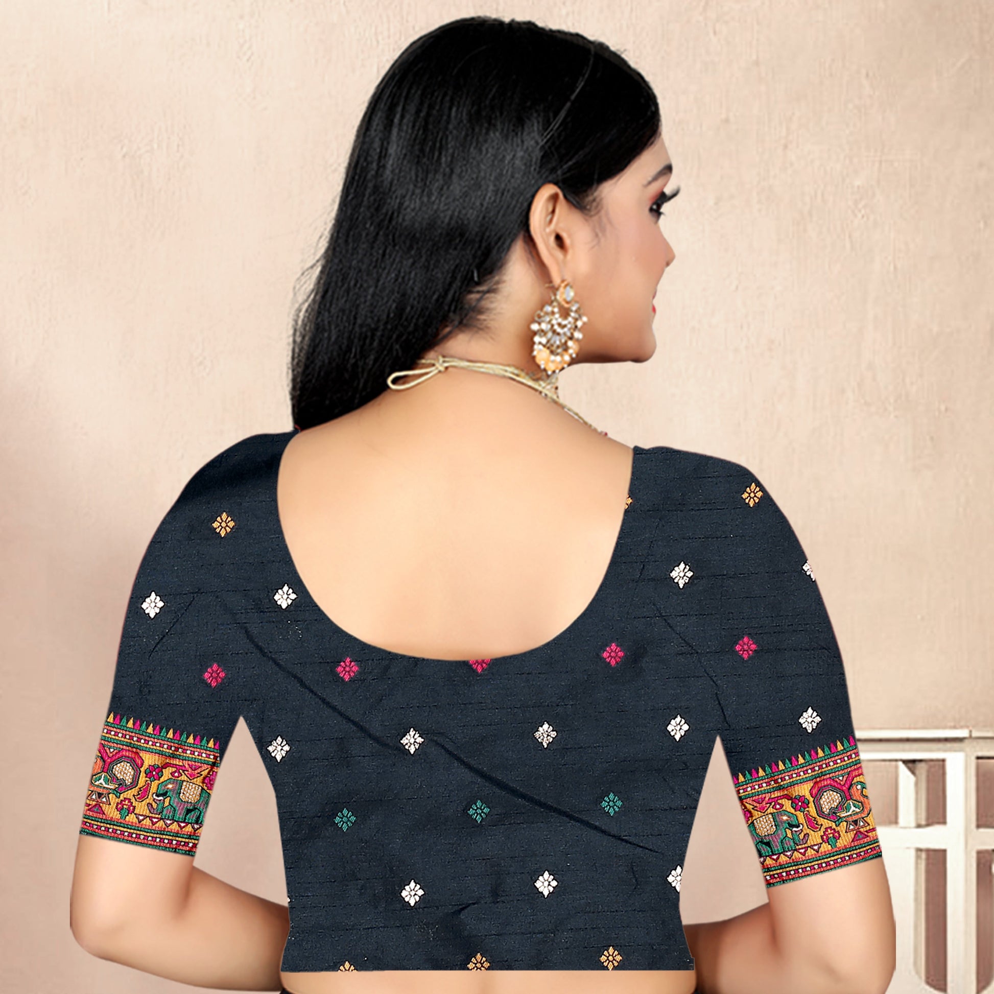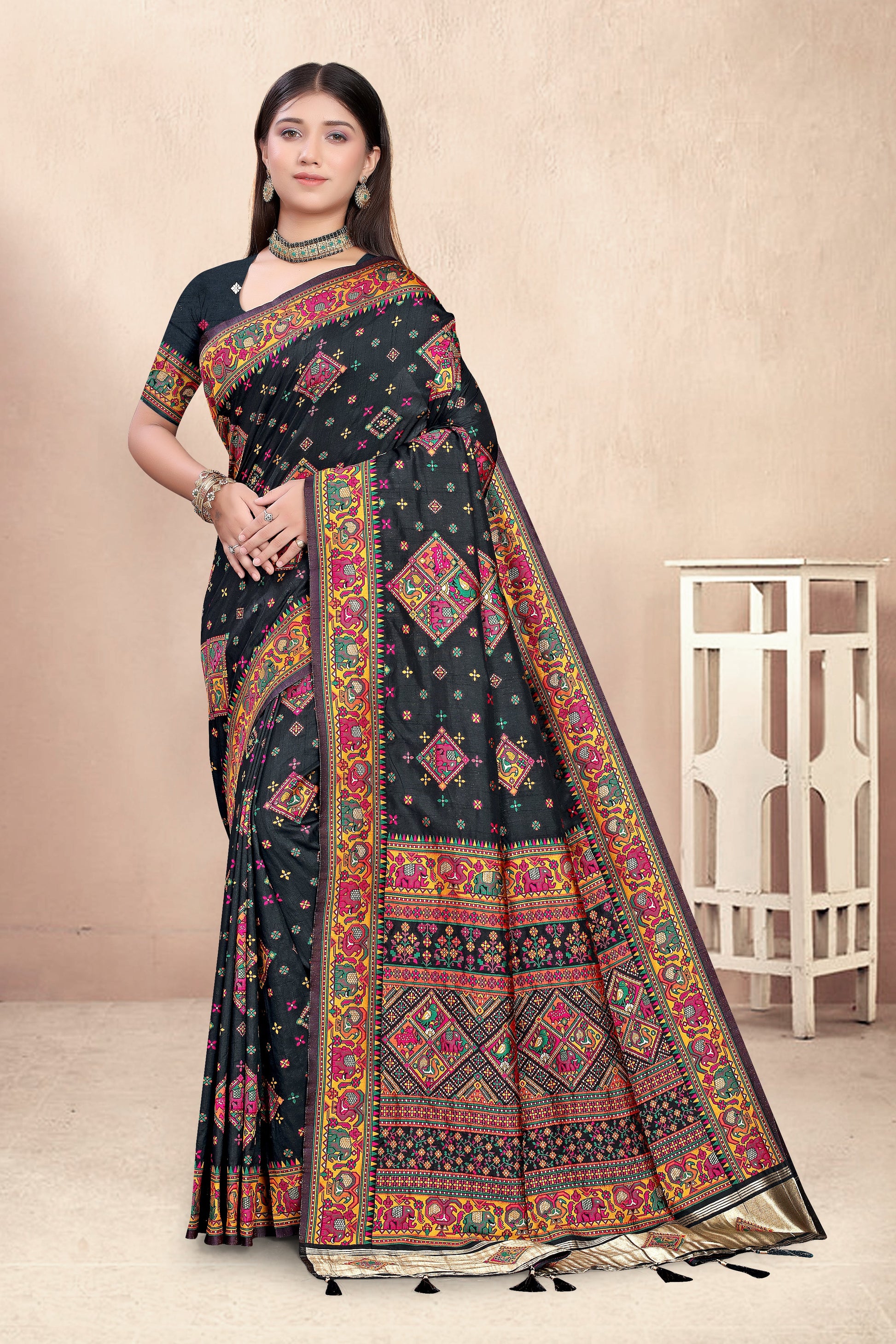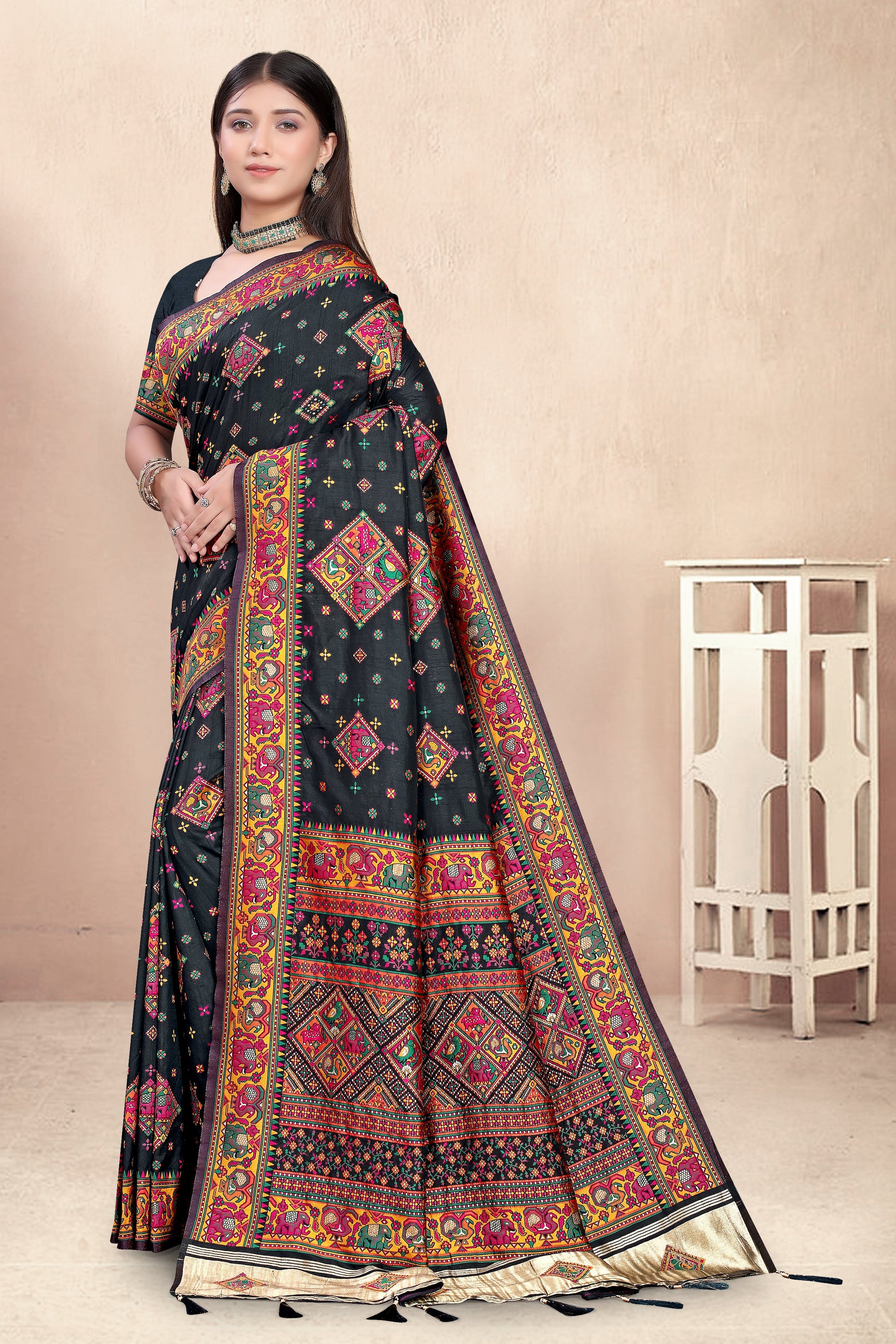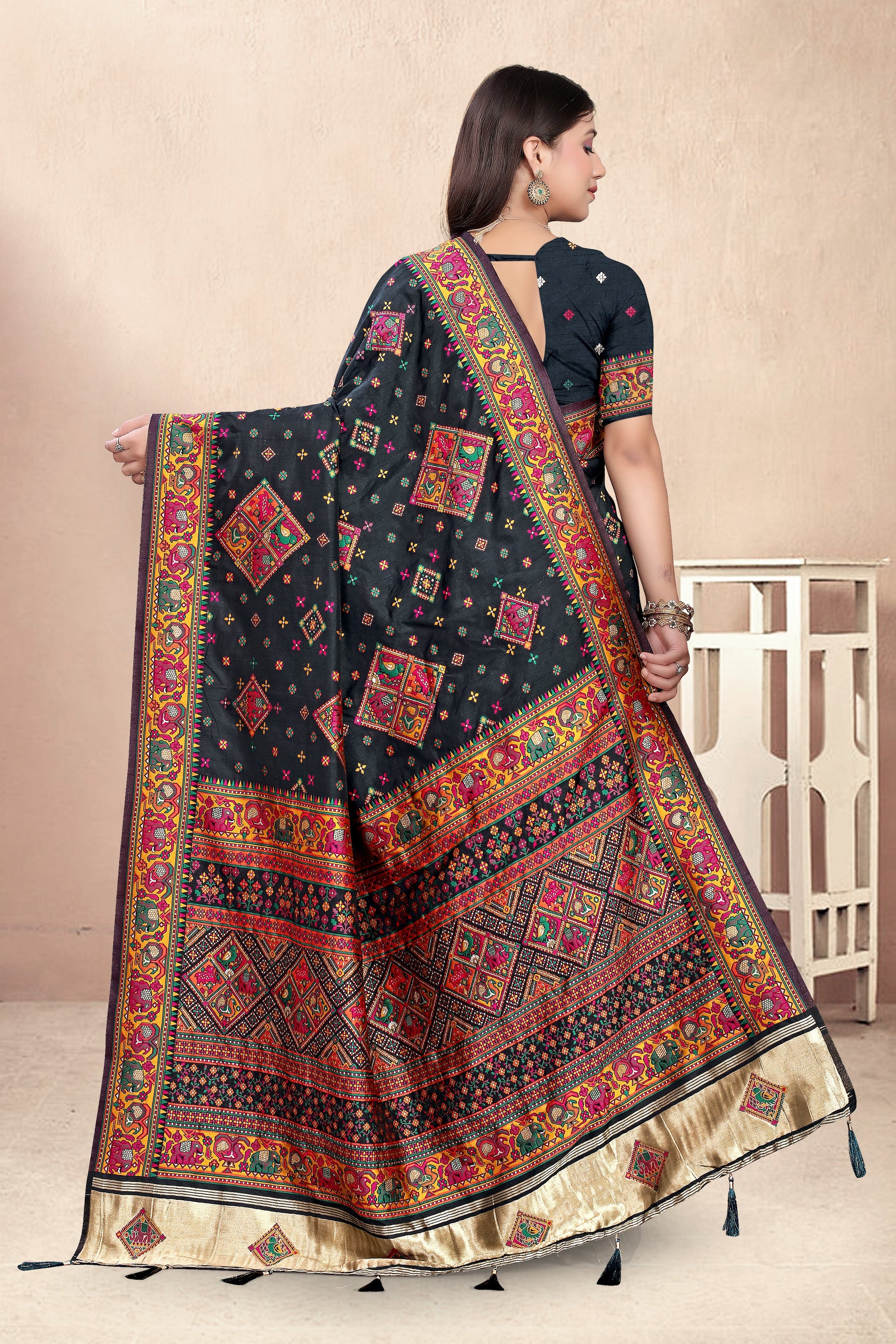 This black Banarasi saree redefines ethnic charm with a powerful presence and intricate craftsmanship. The deep black base provides the perfect backdrop for traditional motifs — including lotus vines, kalash, parrots, and temple elephants — woven into the body using multicolor resham and zari threads. A luxurious border featuring floral vines and traditional kairi motifs frames the saree with grandeur. The highlight is its vibrant pallu: a Patola-inspired patchwork of colourful squares adorned with miniature tribal designs, dancing figures, and heritage symbols in rich shades of pink, orange, mustard, and green.
