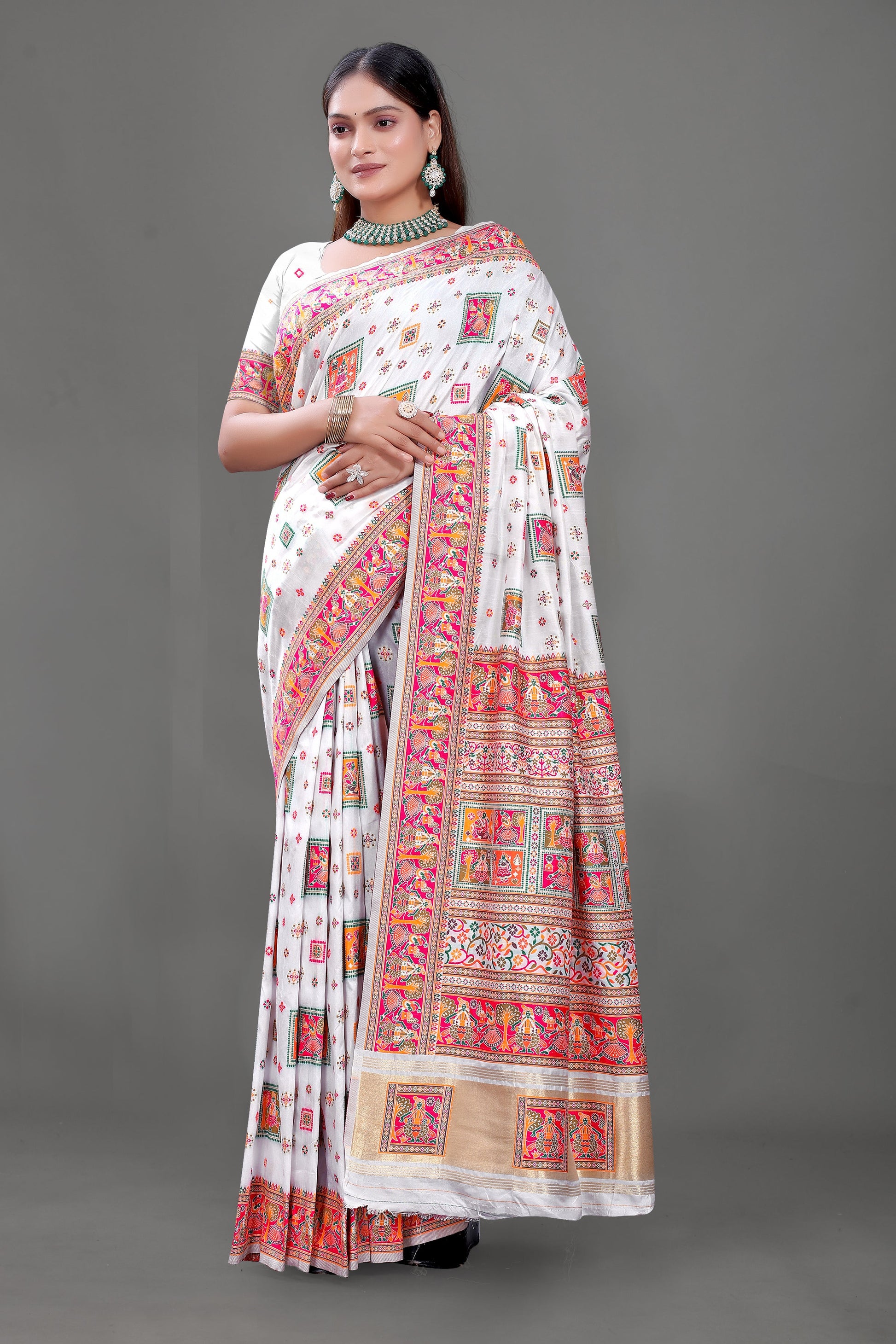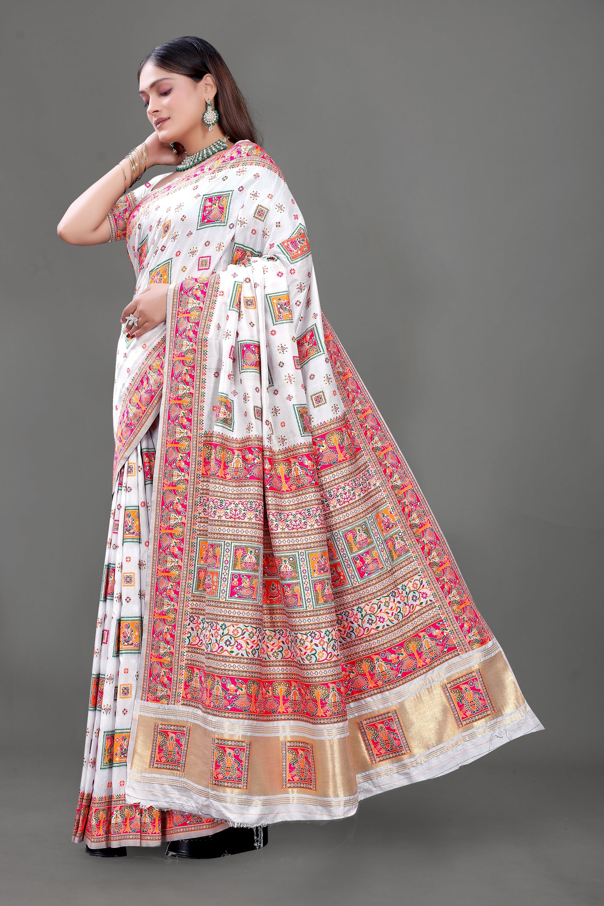 Silken Grace – White Saree with Royal Pink-Gold Elephant Border