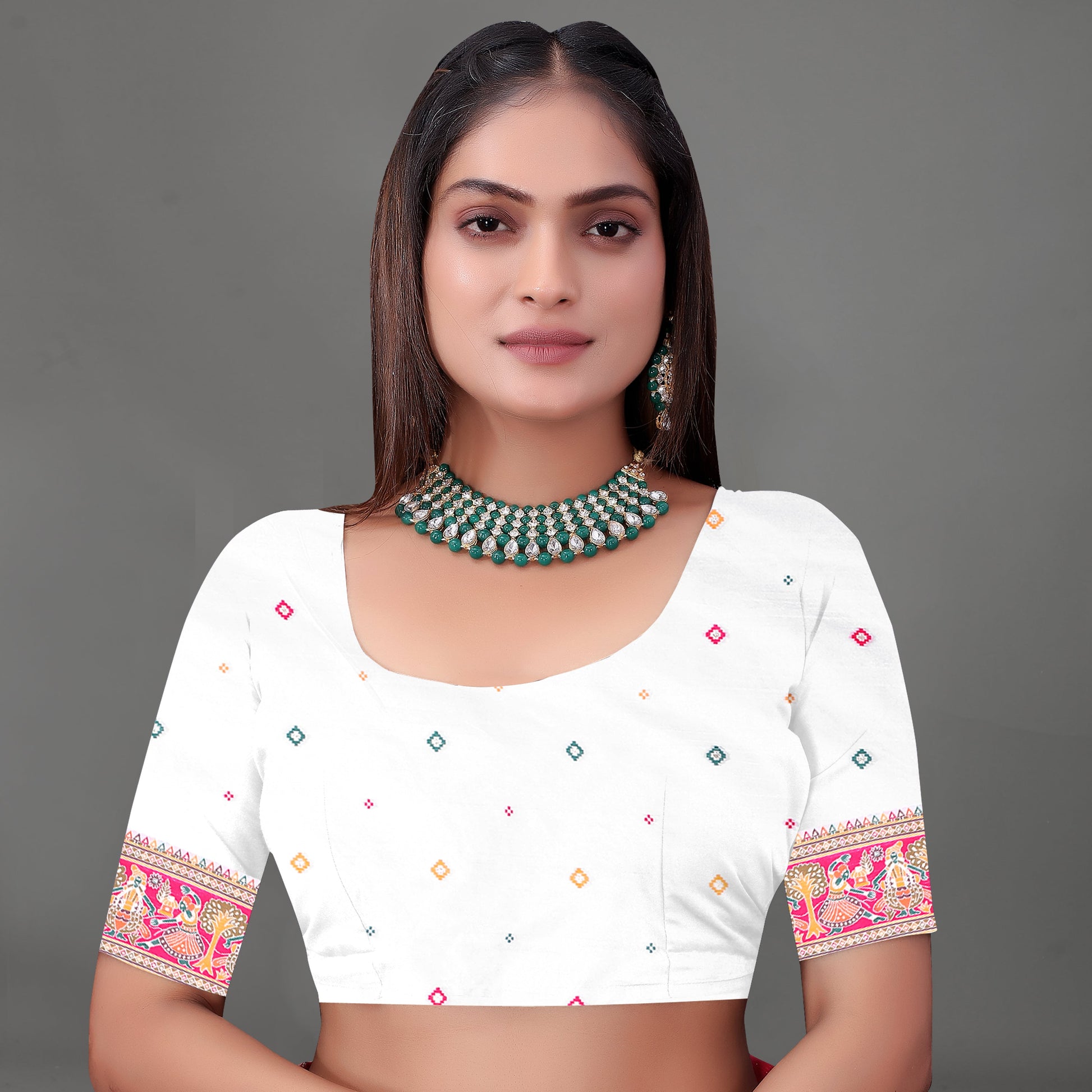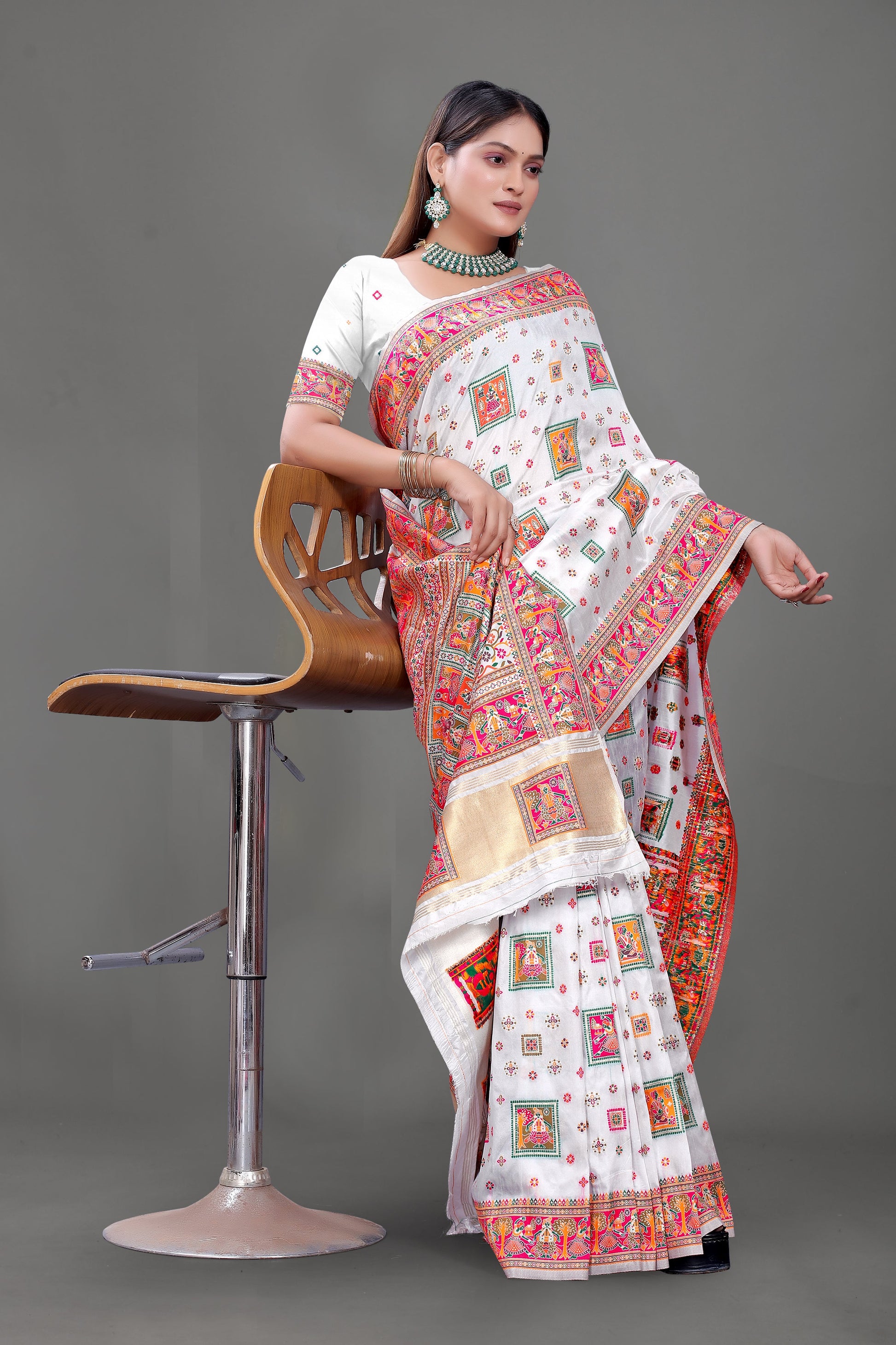 - Type: Designer White Cotton Silk Saree with Heritage Patch Embroidery