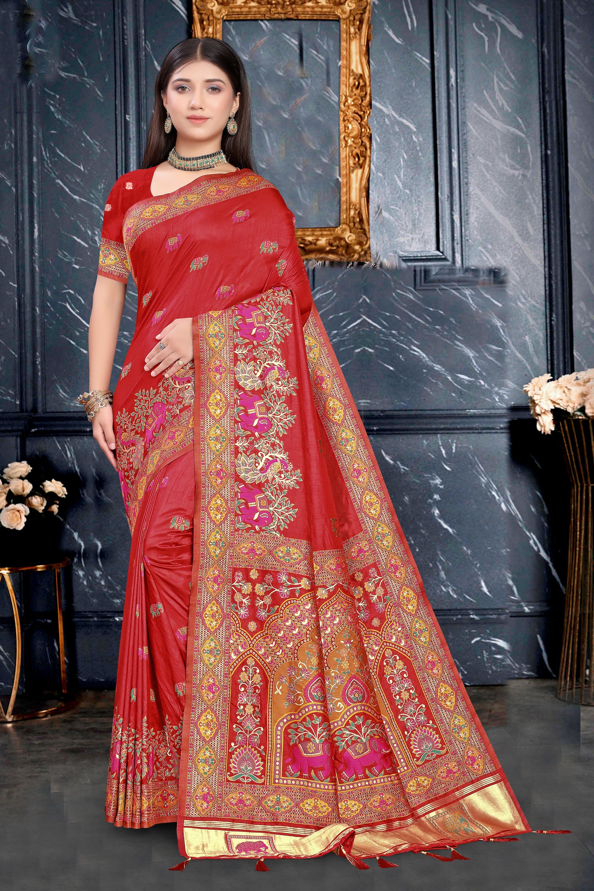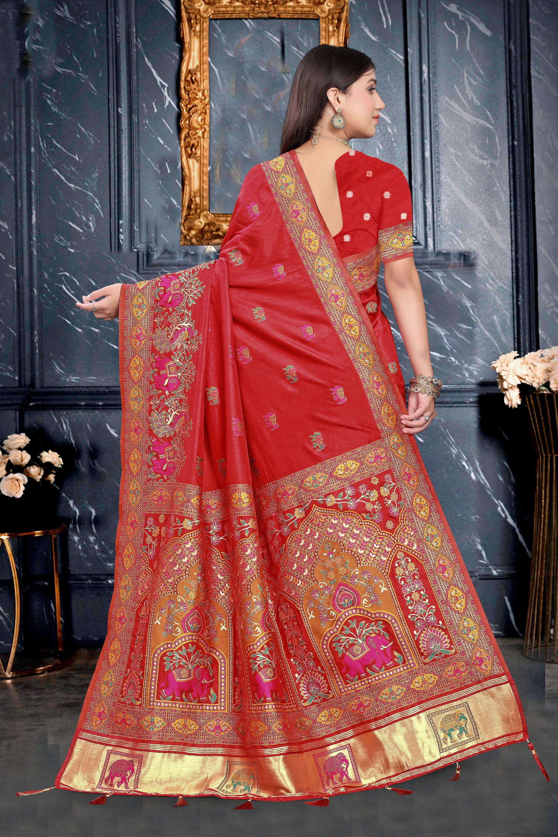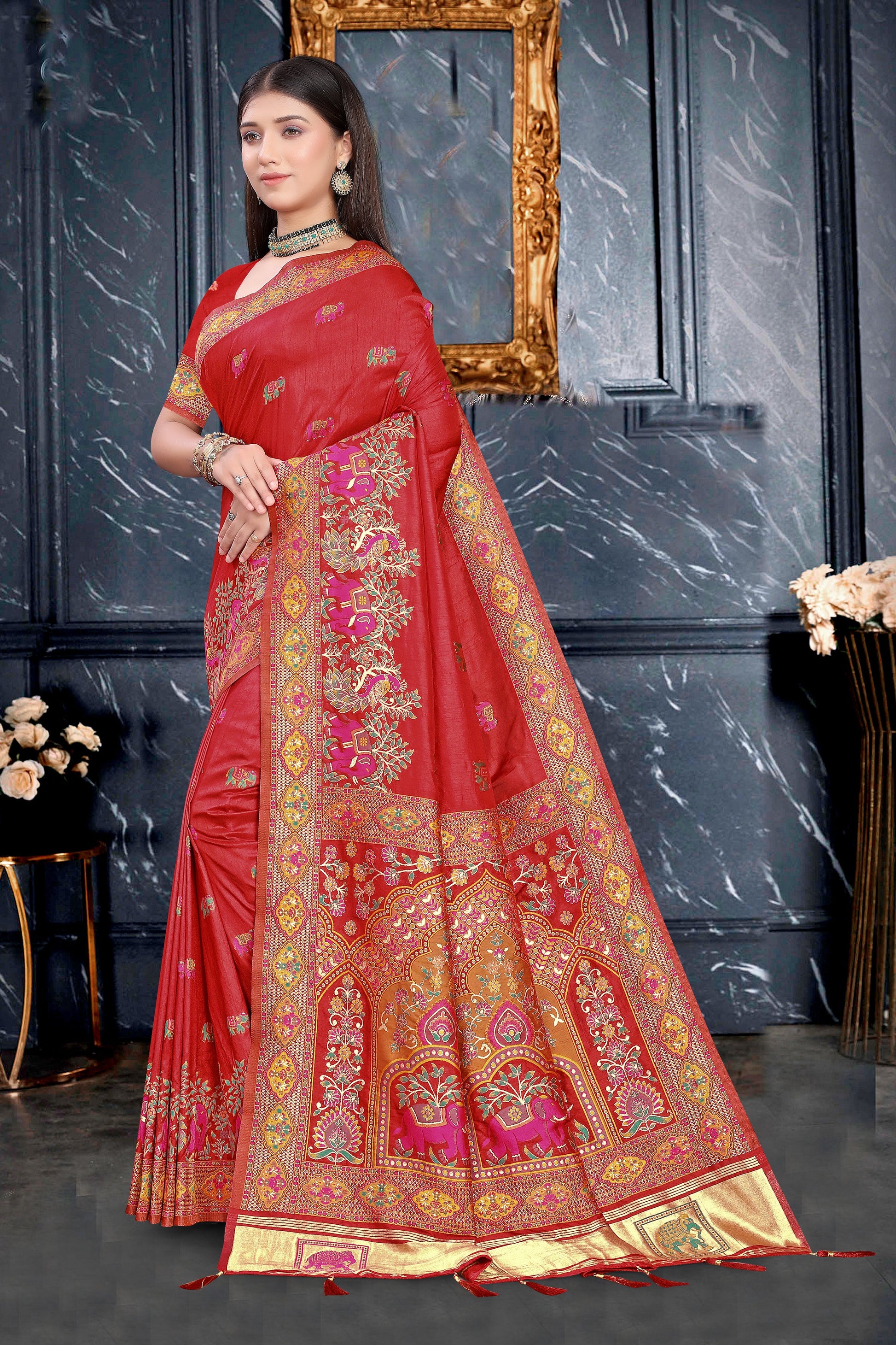 - Type: Maroon Red Art Silk Saree with Zari Border & Elephant Motifs
